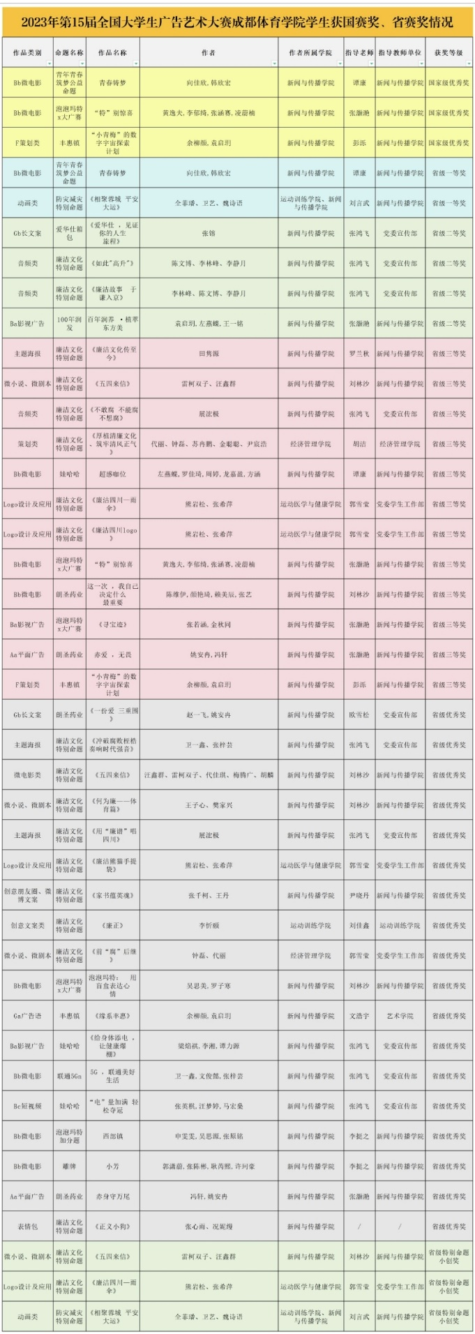 近日,2023年第15届全国老员工广告艺术大赛全国赛结果正式公布,经过校赛、省赛、国赛三个阶段长达5个月的比拼,yl7703永利集团喜获全国赛优秀奖3项(含青年筑梦公益广告1项,商业广告2项),获四川(西藏)赛区省赛奖项32项(含廉洁文化公益广告12项,防震减灾公益广告1项,青年筑梦公益命题1项,商业广告18项)。