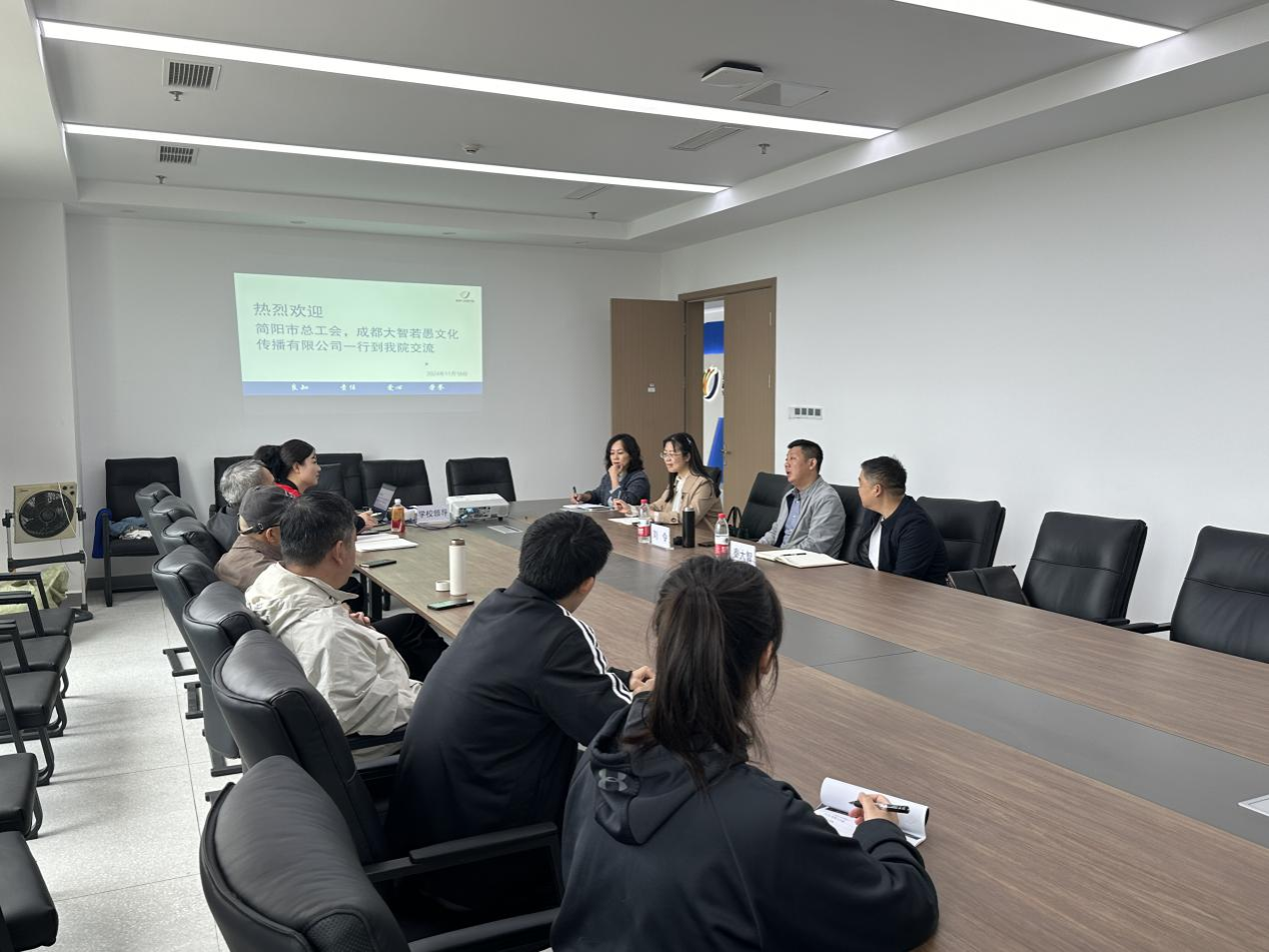 11月8日上午,简阳市总工会党组书记、常务副主席刘令,成都大智若愚文化传播有限公司董事长秦大智一行到公司开展合作交流座谈会。公司经理石磊、党委副书记冯瑞、相关专业负责人、员工管理办公室以及研究生管理办公室教师参与此次交流座谈会。