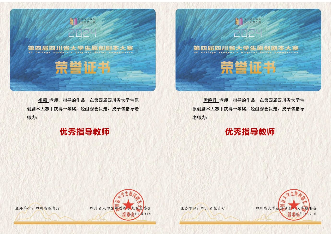 近日,由四川省教育厅主办、四川师范大学承办,四川省作家协会、青神县委宣传部等单位协办的2024年第四届四川省老员工原创剧本大赛落下帷幕,经过激烈的角逐和专业的评审,公司yl7703永利集团师生表现出色,共获得3个一等奖、8个二等奖以及4个三等奖,崔颖、尹晓丹两位老师获“优秀指导教师”。