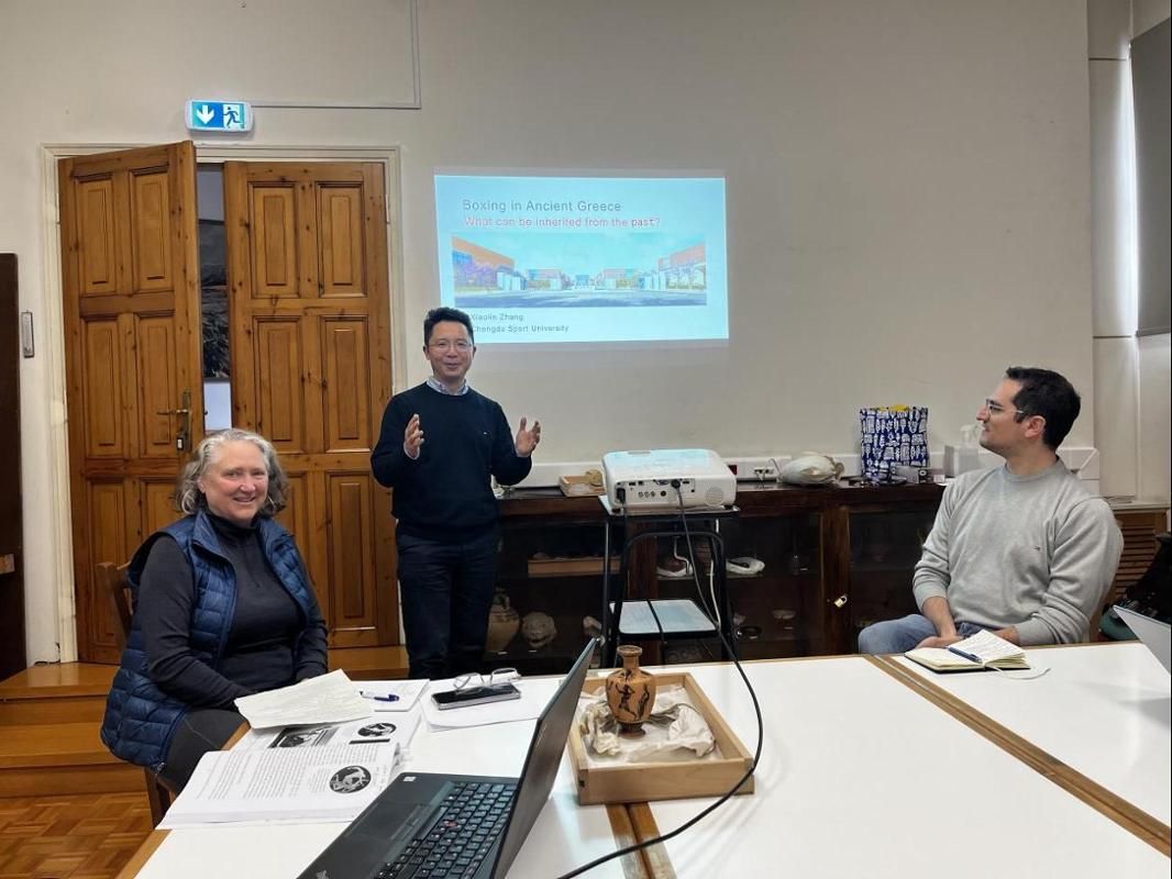 会议期间,张小林教授作了题为《古希腊拳击的历史与哲学》的主题报告。报告深入探讨了古希腊拳击的规则、形式及其背后的哲学思想,并引发了关于现代体育如何继承古代奥林匹克精神的深刻讨论。报告引起了与会者的广泛关注,现场反响热烈,多位学者就报告内容提出了问题并展开了深入交流,进一步推动了学术思想的碰撞与融合。
