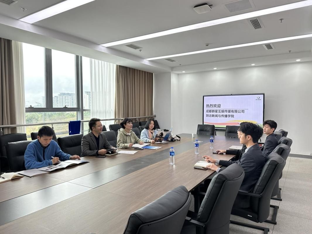 10月24日下午,成都群星互娱传媒有限公司总经理彭科翔一行三人到访yl7703永利集团,进行校企合作座谈。公司党委副书记冯瑞、副经理张小林等5人参加了此次座谈。