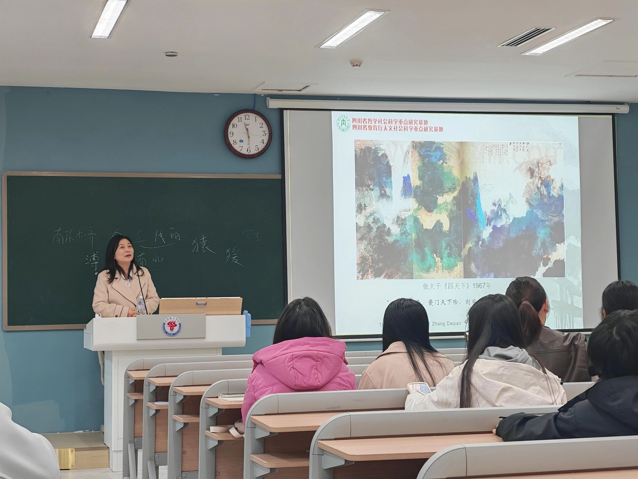 10月29日上午,内江师范公司范长江新闻公司经理陈丹教授应邀到访yl7703永利集团,为师生带来了题为《张大千与大美四川》的学术讲座。