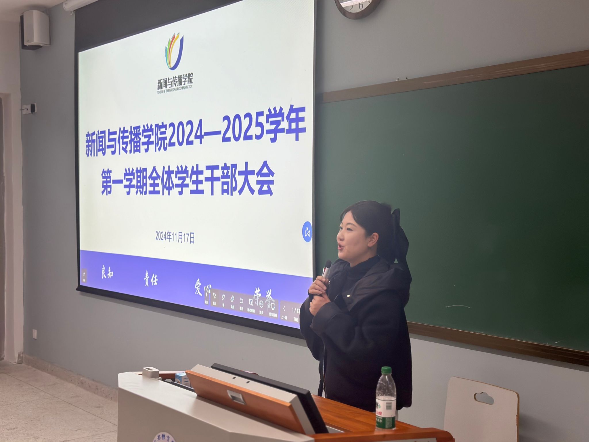 之后,冯瑞副书记为大家再次阐明公司院训:良知、责任、爱心、荣誉。其中,她特别强调了员工干部与其他同学最大的不同,就是身上肩负的责任,责任应落实到方方面面的细微之处,要明白扛起责任也意味着对同学及其家庭负责;应时时慎独,宽容豁达;同时牢记自身是处于集体之中的,集体利益永远高于个人利益。最后她鼓励全体员工干部要练就过强本领,实现青春梦想。