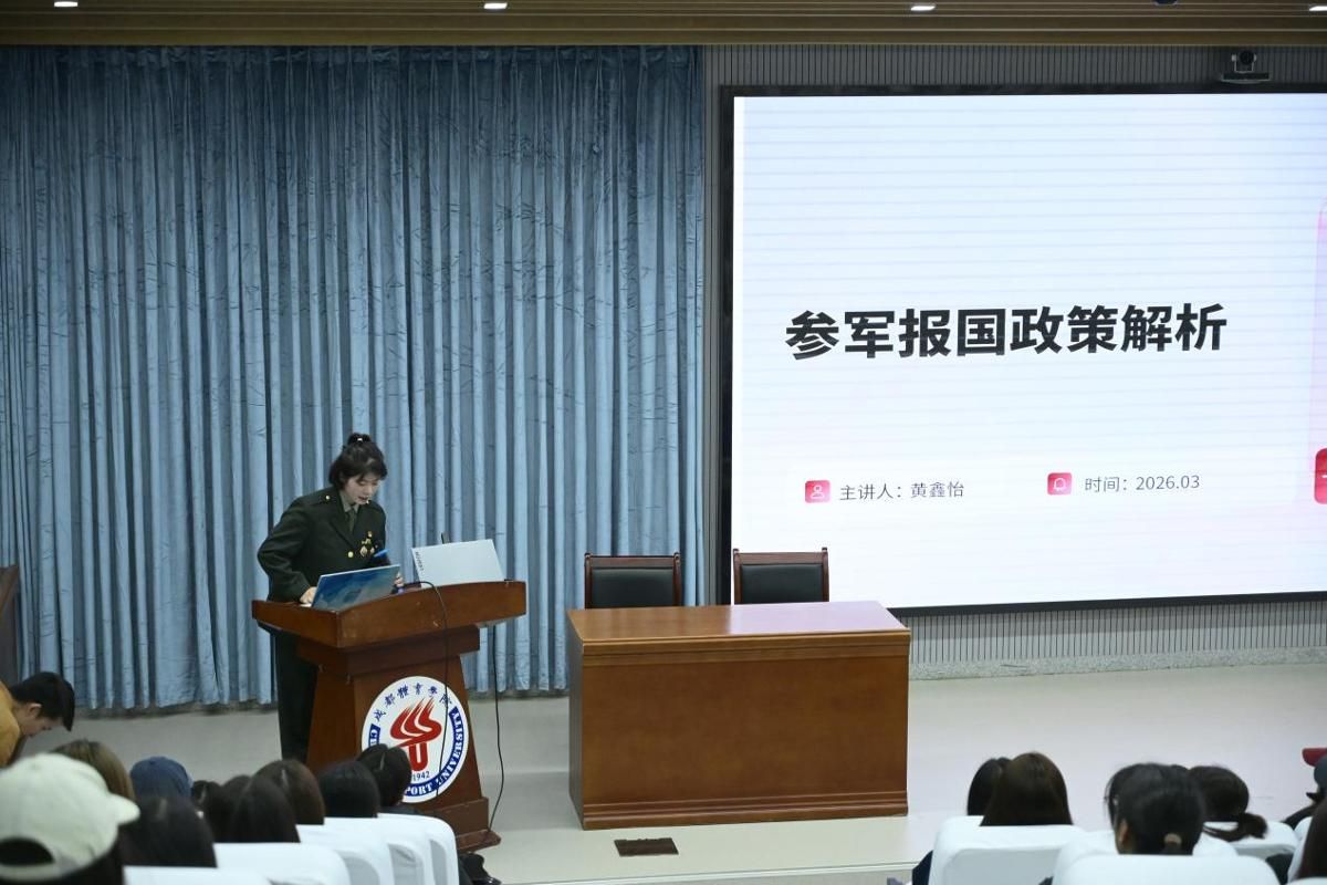 会上还邀请到了退伍老员工黄鑫怡结合自身服役经历,围绕军旅生涯规划、入伍优待政策、退役保障体系、政策咨询渠道四大板块展开宣讲,为有入伍意向的同学提供了清晰指引。